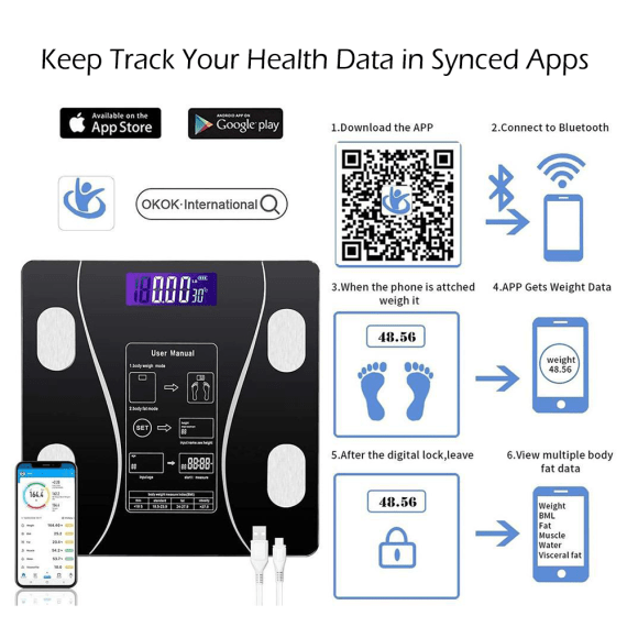 User-friendly app displays all the data including body weight, body fat, water, muscle mass, BMI, BMR, bone mass and visceral fat.