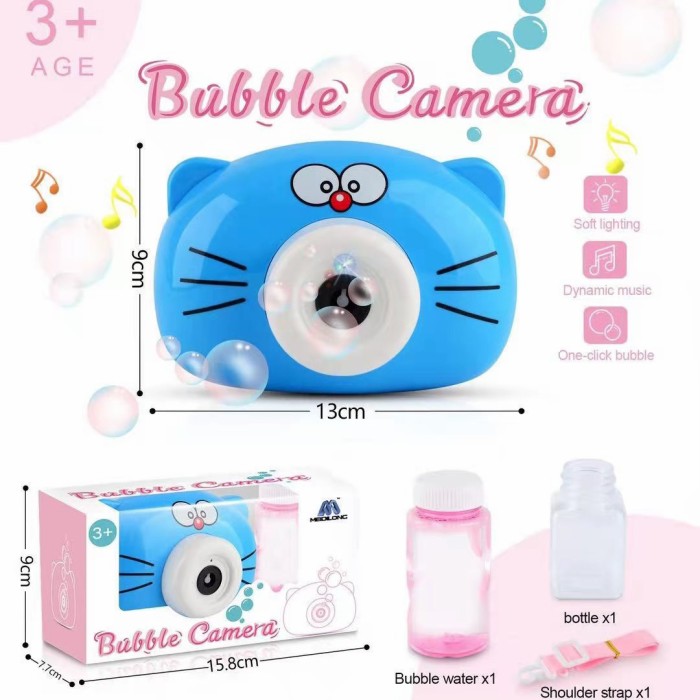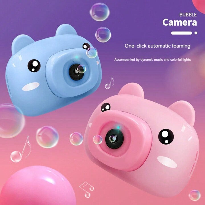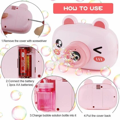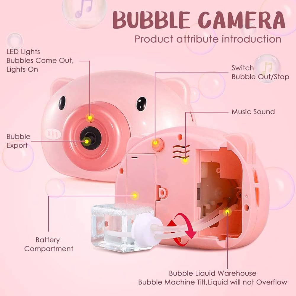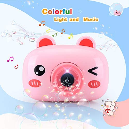 This camera bubble maker machine is child friendly. Just install the bubble solution into the bubble machine, press and hold the switch button, the bubble toy will blow out hundreds of bubbles. The bubble machine is also equipped with lights and music, music can be turned off independently, making it more fun .