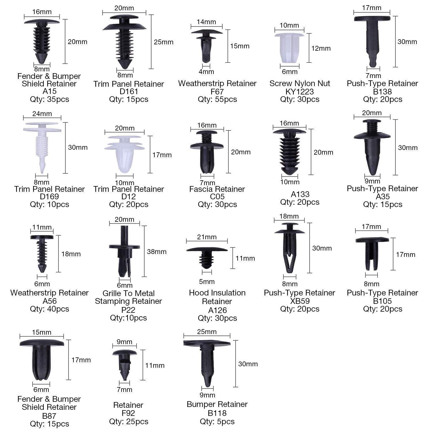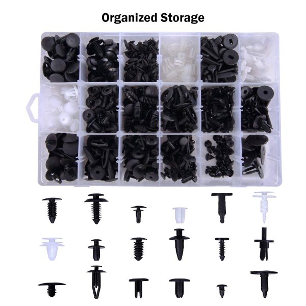 With 16 most popular sizes of auto push pin rivets, this kit is compatible with a wide range of car models including GMC, Toyota, Ford, Honda, Acura, Nissan etc.Customers have reported that the clips and fasteners in this kit work as they should, providing a reliable solution for securing various parts of the car.The set includes a good selection of parts, with many different sizes available to accommodate different car models and repair needs.The included tools are also handy and functional, making it easy to use the clips and fasteners effectively.Rivet post pressure expands legs for fast and permanent fastening.Used widely for car fender, bumper, door, leaf board or other car suface .These rivets are made of the plastic materialApplication: suitable for many cars. Easy to use.They can be used on buses, trains, planes, truck, caravans and cars.